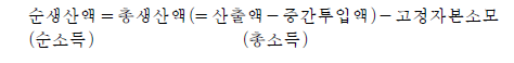 자동차공장을 예를 들어보면 먼저 자동차를 만들기 위해서는 차체 등 각종 부품이 있어야 하며 또 각종 부품을 조립하는 기계가 있어야 한다. 자동차를 만들게 되면 부품도 소모되지만, 조립기계도 닳게 된다. 여기에서 총생산액은 산출액에서 부품구입액 등 중간투입액을 차감한 총부가가치를 말하고 순생산액은 총부가가치에서 고정자본소모를 뺀 순부가가치이다. 그런데 고정자본소모는 현 수준의 생산활동을 지속하기 위하여 언젠가는 지출될 부분이므로 이 공장의 측면에서 보면 총생산보다는 본래의 기계 가치를 그대로 유지하면서 새로이 생산해 낸 부가가치 즉 순생산이 더욱 의미가 있을 것이다.
